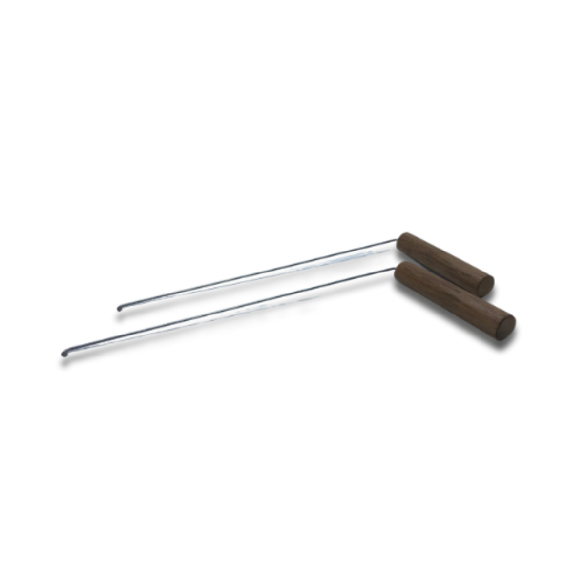 Material: Varetas em aço inox polido com ponta de proteção, cabos em madeira cedro com mancal