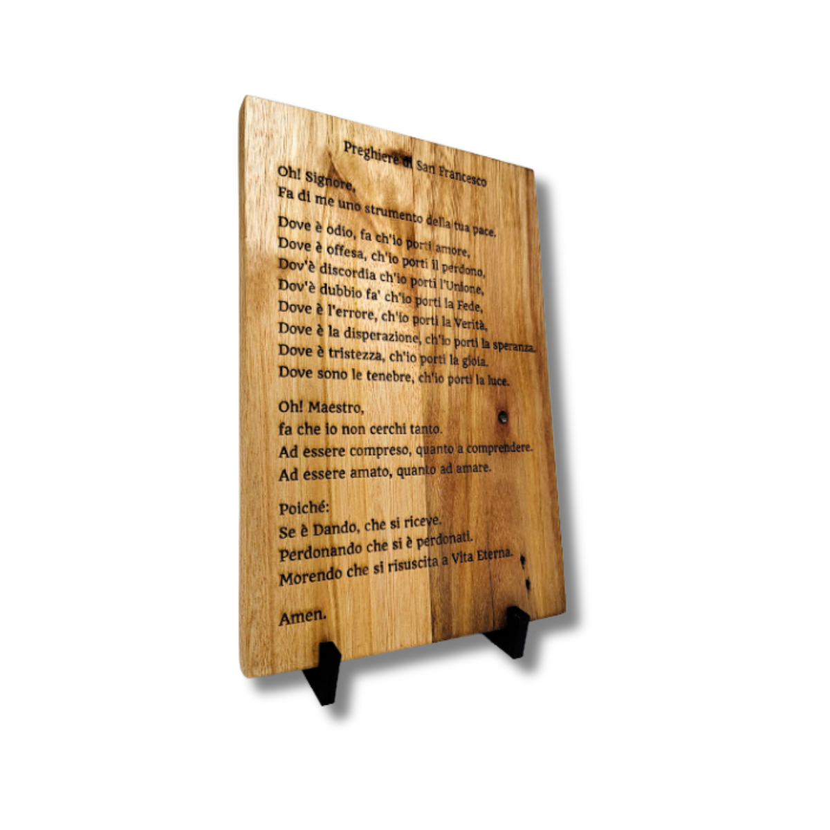 Placa em madeira maciça com suporte, trazendo a Oração de São Francisco em português de um lado e em italiano, inglês, espanhol ou francês do outro.
