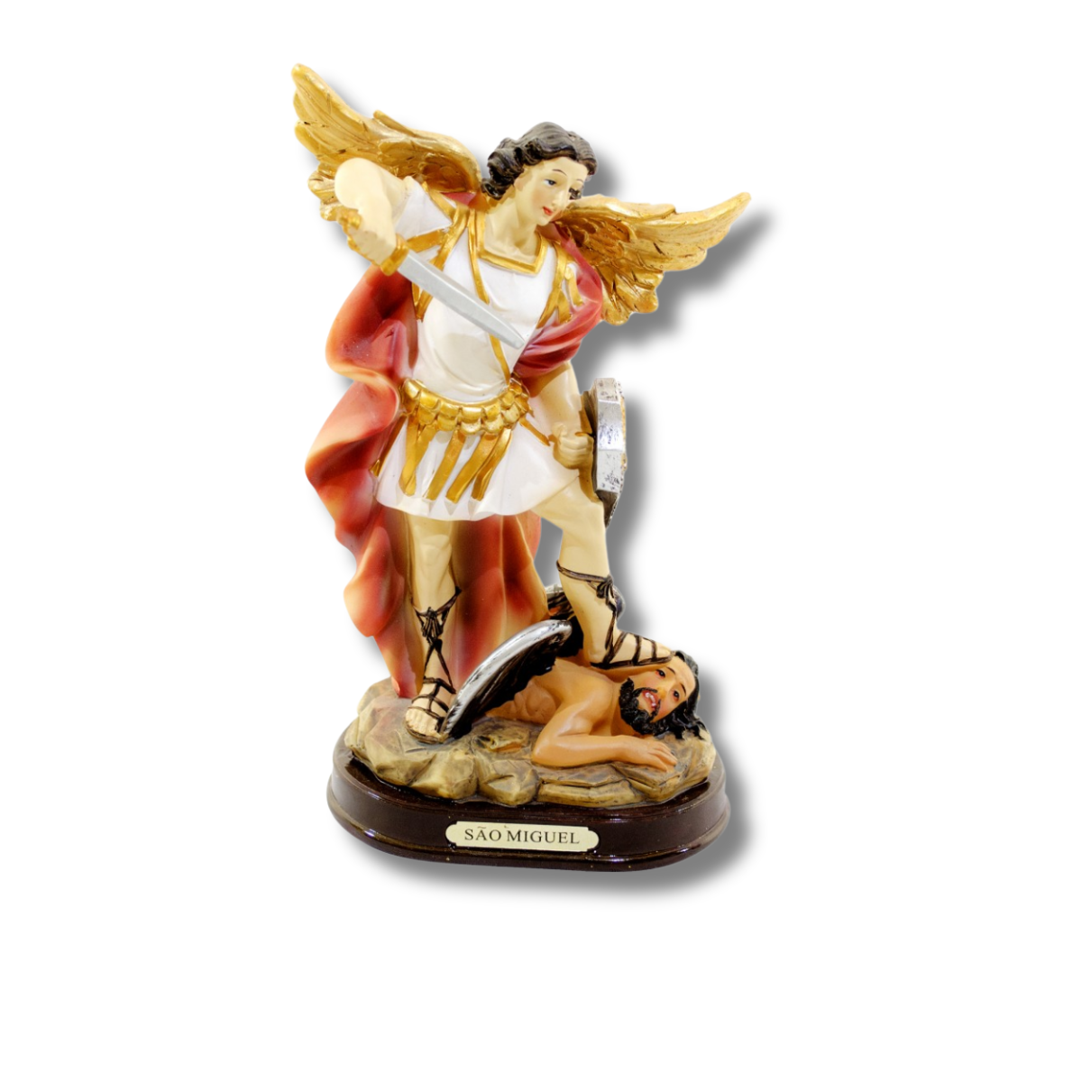 Escultura detalhada do Arcanjo Miguel, confeccionada em resina plástica de alta qualidade. Com excelente acabamento, é uma peça que representa proteção e força espiritual.