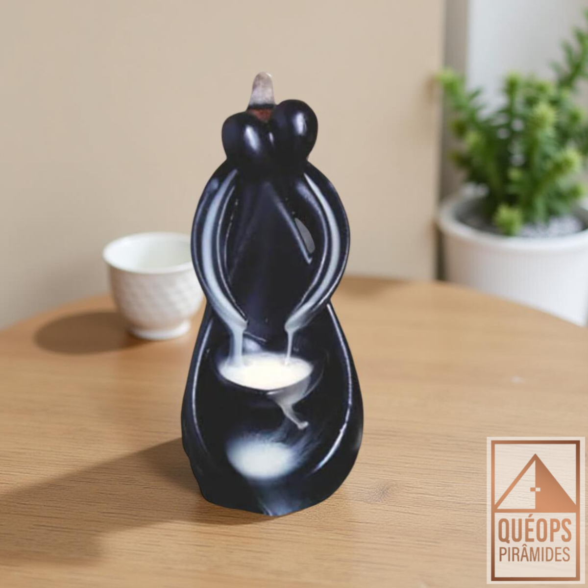 O incenso queimará por até 20 minutos, enquanto a fumaça desce suavemente, complementando o design dos dois corpos unidos.
