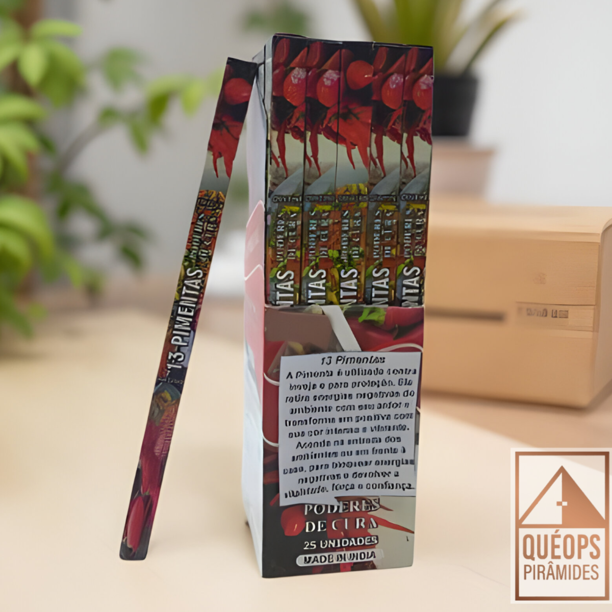 A pimenta é conhecida por sua ação protetora e fortalecedora. Seu aroma intenso e vibrante transforma ambientes, trazendo vitalidade e confiança. Ideal para ser aceso na entrada dos ambientes ou próximo a portas para promover uma sensação de renovação e proteção energética.