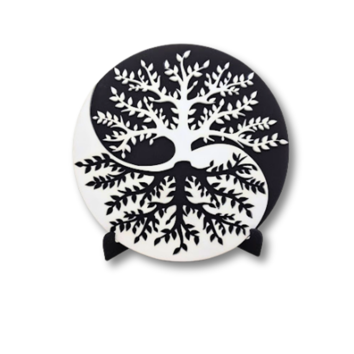 Mandala compacta com o símbolo da Árvore da Vida, representando a harmonia e a conexão com o universo. A impressão 3D em preto e branco dá um toque elegante e simbólico ao ambiente.
