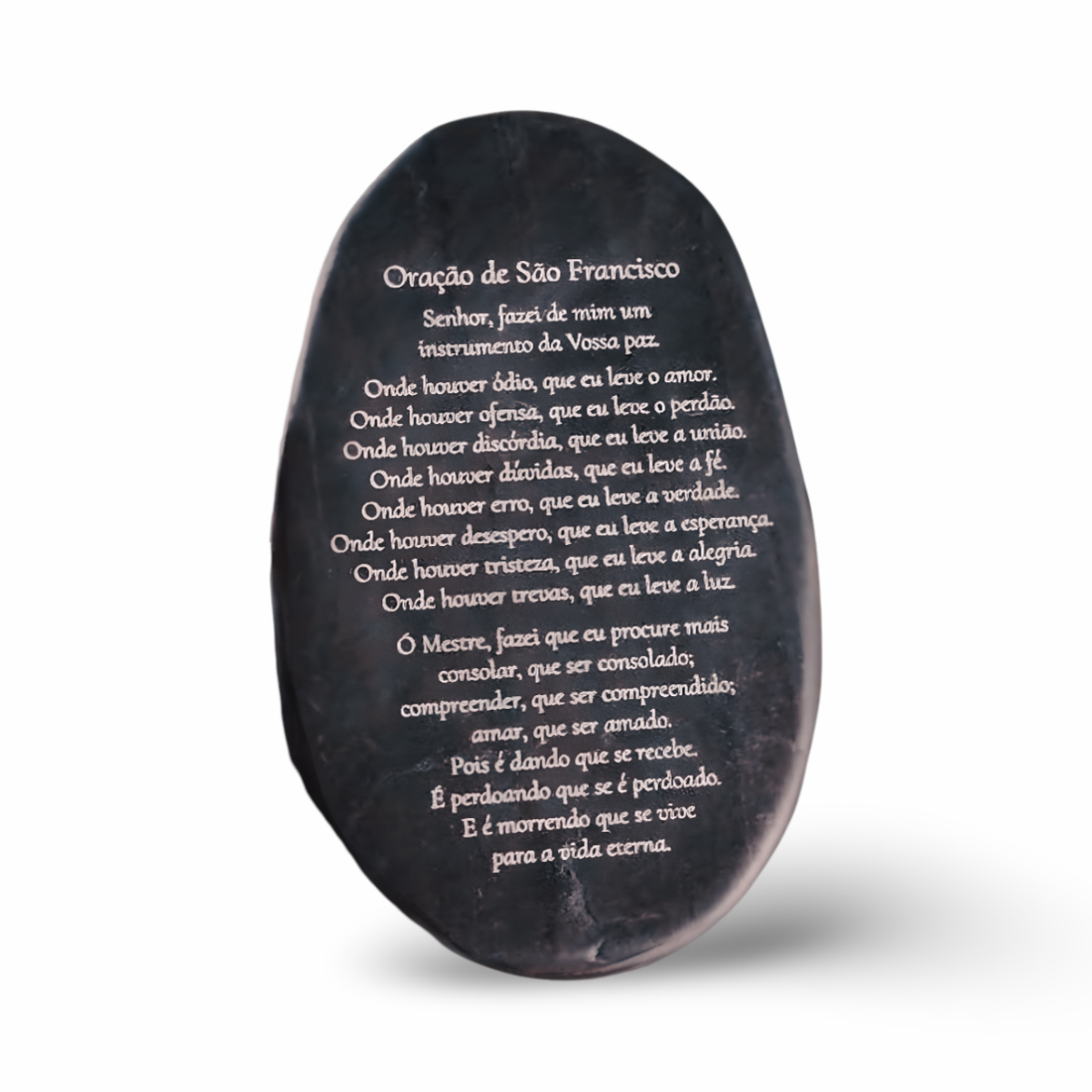 Peça refinada feita em pedra basalto, com gravação a laser da imagem da Oração de São Francisco. A pedra, de origem vulcânica, carrega as energias da terra e do fogo, contribuindo para o equilíbrio emocional, a conexão com a natureza e o cultivo da simplicidade e humildade.