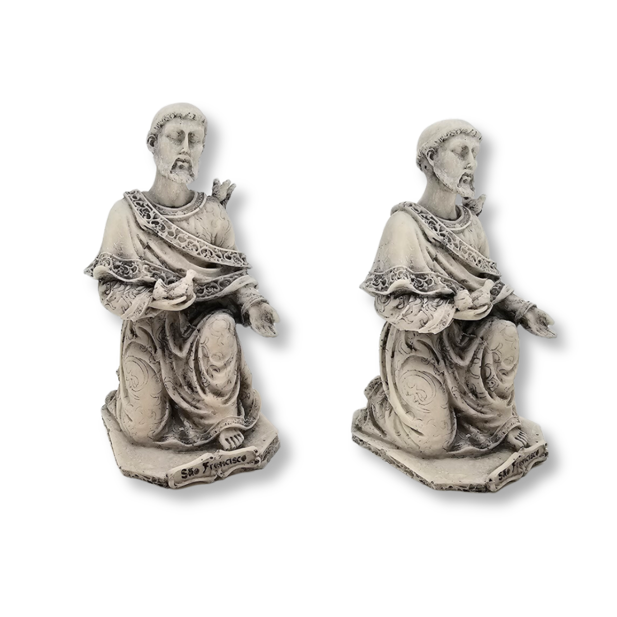 Escultura de São Francisco de Assis, pintada à mão com acabamento em concreto pátina. Ideal para quem busca uma representação simbólica de serenidade e bondade.